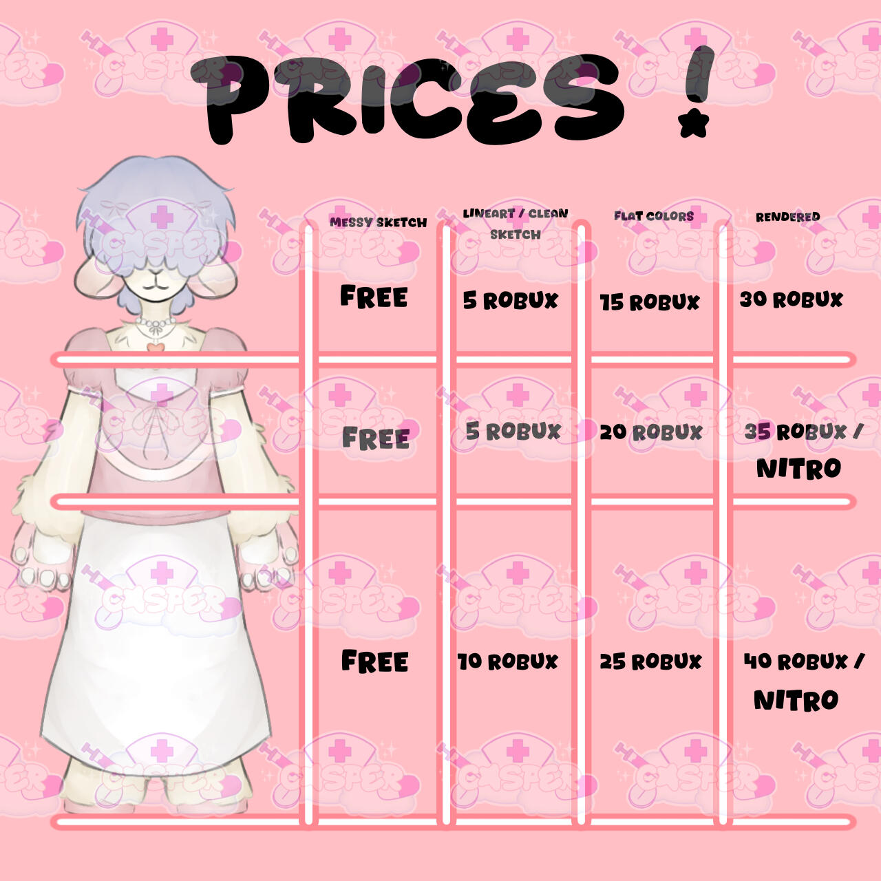 - Paying via robux - I will send the link to the game.- To pay, please go to the store and there will be gamepasses you can use to pay me.- Select the gamepass you have commissioned me to draw. For example, if you commissioned me for a chibi character, click the chibi gamepass!- Paying via nitro - please gift it to me BEFORE I start drawing.